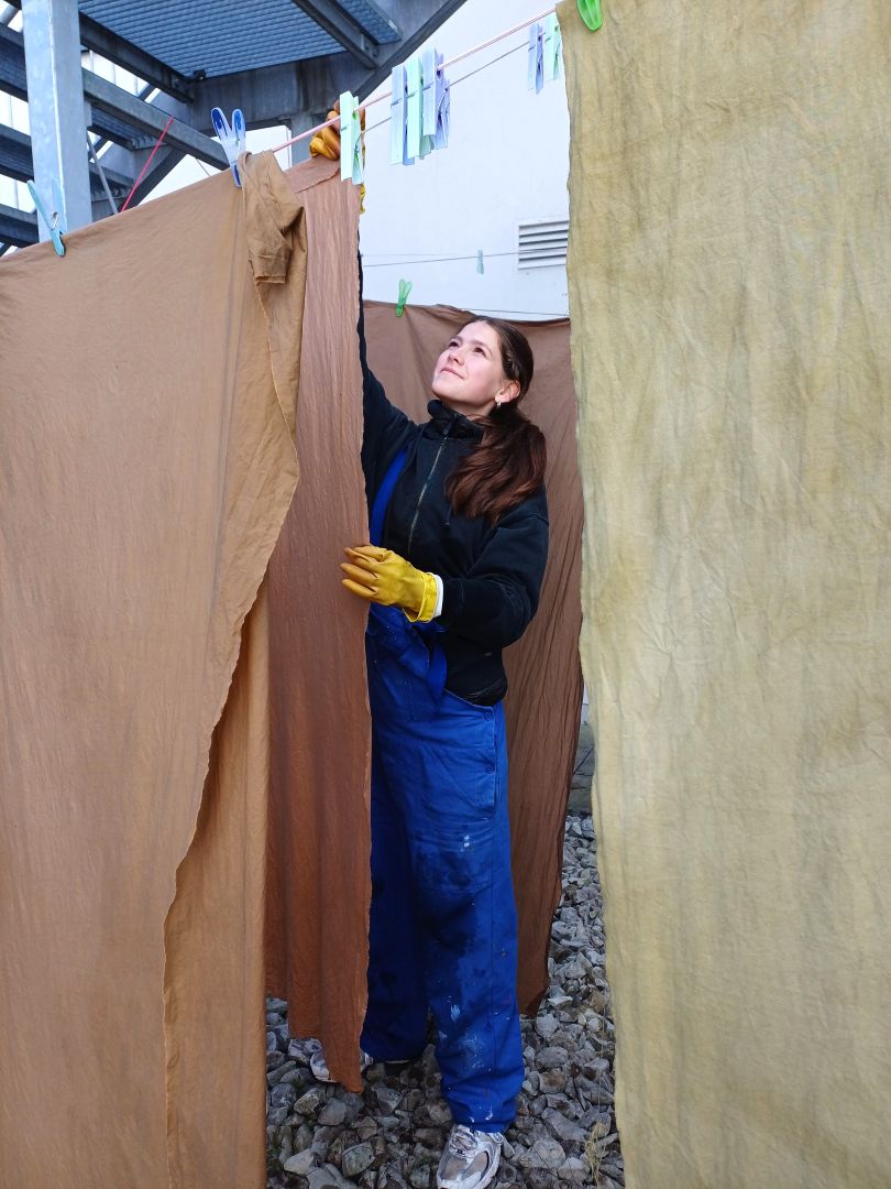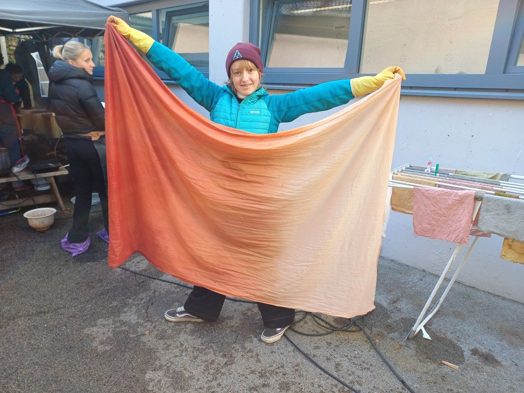 Die Schüler*innen des 2. Jahrgangs haben zu Beginn des Schuljahres mit Christiane Seufferlein einen Färbeworkshop absolviert. Christiane Seufferlein ist Handwerksvermittlerin und Dozentin im textilen Bereich. Sie forscht zur Leinentextilgeschichte in Österreich und international. Ihre Schwerpunkte sind das Handspinnen, das Färben mit Naturmaterialien und die allgemeine Gewinnung von Fasern.